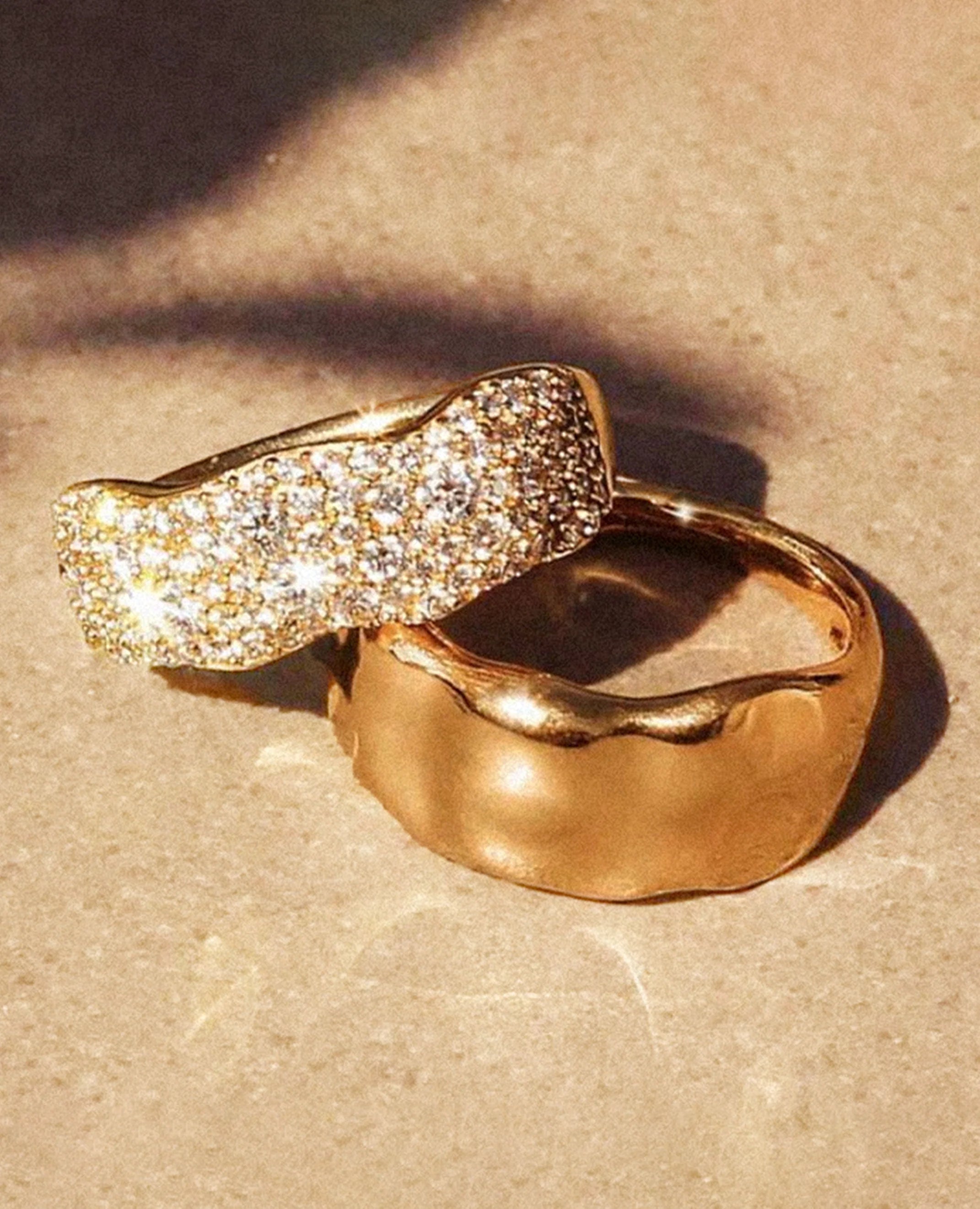 Molten, hammered gold designs that feel like sun glitter, the sparkling light formed when sunlight reflects on water.