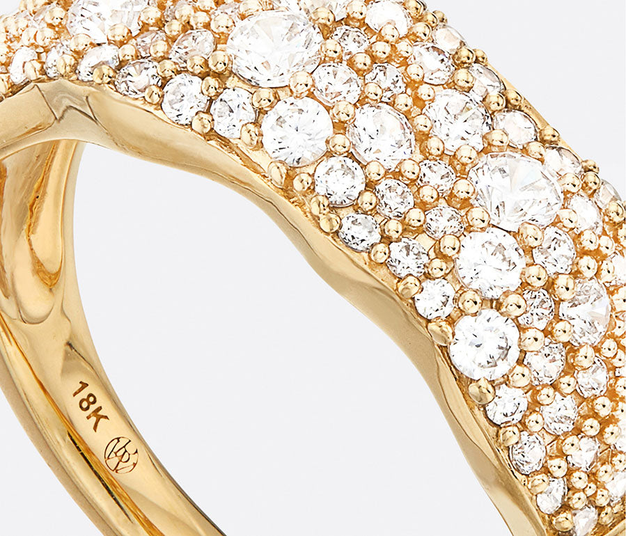 Pavé (pronounced pah-vay) comes from the French word for "paving," and refers to a dramatic type of stone setting in which several small clusters of diamonds create a field of sparkle. Pavé settings, originally inspired by French cobblestone roads, are coveted by diamond lovers everywhere.