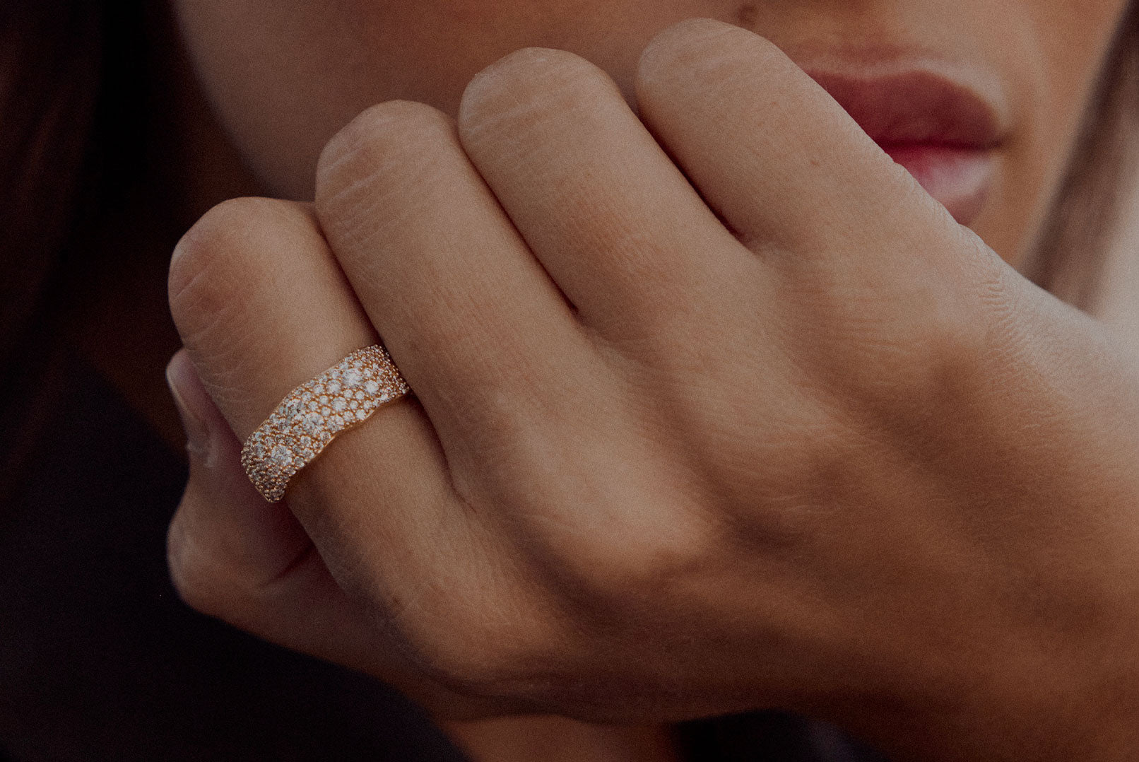 Our special collection features hand-cut, Pavé diamonds that radiate femininity and sparkle from day to night. Each piece is captivating; forever jewelry that romances your life.